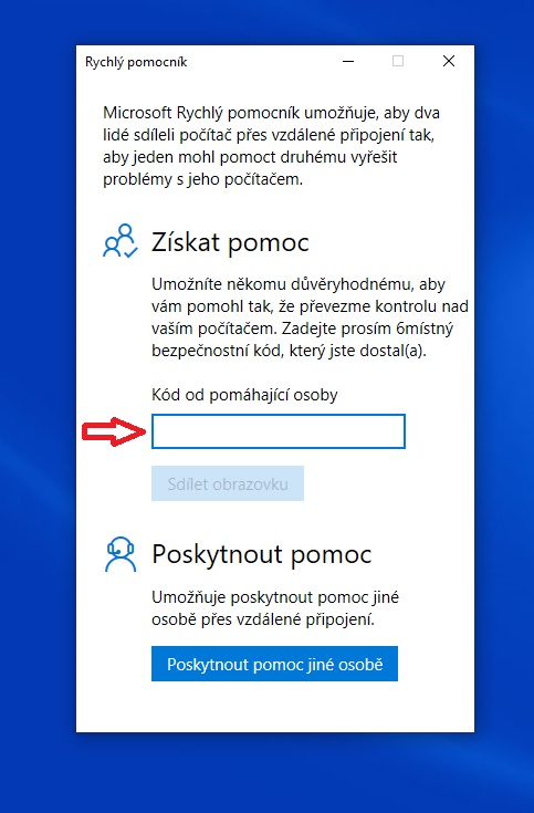 Po spuštění aplikace rychlý pomocník uvidíme kolonku "Kód pomáhající osoby", který Vám sdělí technik. Následně pouze potvrdíme tlačítkem sdílet obrazovku.